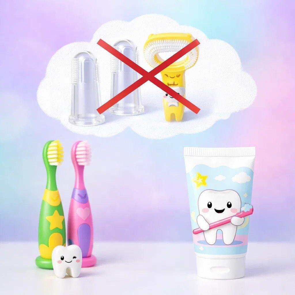 Когда появляется первый зуб, магазины предлагают «всё и сразу». На самом деле ребёнку так много и не нужно. Что действительно пригодится ⬇️ • Детская щётка (с маленькой головкой и мягкой щетиной) • Паста с фтором (в возрастной дозировке, размером с рисовое зёрнышко)