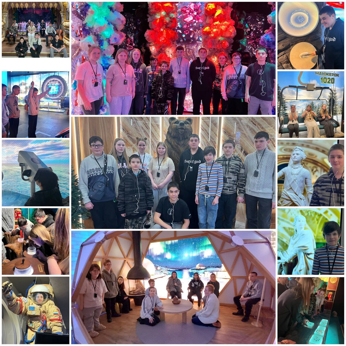 » 🪆🇷🇺🪆. Полтора часа увлекательного путешествия по федеральным округам и регионам нашей необъятной страны пролетели незаметно. Так и хочется спеть: «Зачем мне солнце Монако», когда столько уникальных мест есть в России. 🌏 🌋 Дальневосточный регион удивил своими вулканами, гейзерами и горячими источниками. Побывали на космодроме «Восточный» и передали привет в космос 🚀🪐. Познакомились с обитателями уссурийской тайги 🐅🐻, ощутили аромат дальневосточного леса 🌲🌳. Насладились красотами легендарного озера Байкал 🐟. 💎Окунулись в атмосферу уральских рудников, узнали о месторождениях изумрудов, аметистов, топазов и других самоцветов. В Приволжском округе находится один из крупнейших IT-кластеров страны. Поразил автомобиль КАМАЗ с 5D-кинотеатром и скоростное речное судно на подводных крыльях «Метеор». 🌉Прошли по самому длинному в Европе Крымскому мосту. Северный Кавказ встретил настоящим символом силы и инноваций: здесь мы узнали о новейших ледоколах-гигантах, прокладывающих путь д