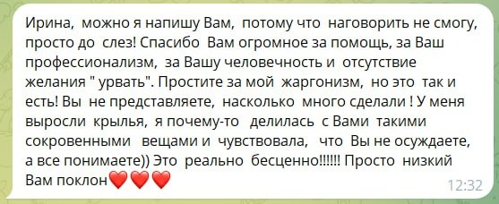 Чаще всего — это люди. Доверие. Моменты, когда тебе открываются по-настоящему. Я получила сообщение, после которого просто не смогла сразу ответить. Перечитывала его несколько раз🥹 Хочу сказать спасибо. За такие слова. За доверие. За смелость быть живыми и настоящими🙏 Потому что именно ради этого я и работаю. Ради того, чтобы человеку было спокойно. Чтобы рядом был кто-то, кто не торопит, не давит и не оценивает. Кто объясняет, поддерживает и идёт рядом столько, сколько нужно. Если вдруг вам сейчас тревожно, сложно или непонятно — вы не одни. Я всегда рядом. Связаться со мной можно в WhatsApp или Telegram. Ирина, Ваш психолог в недвижимости🏠 #отзывы
