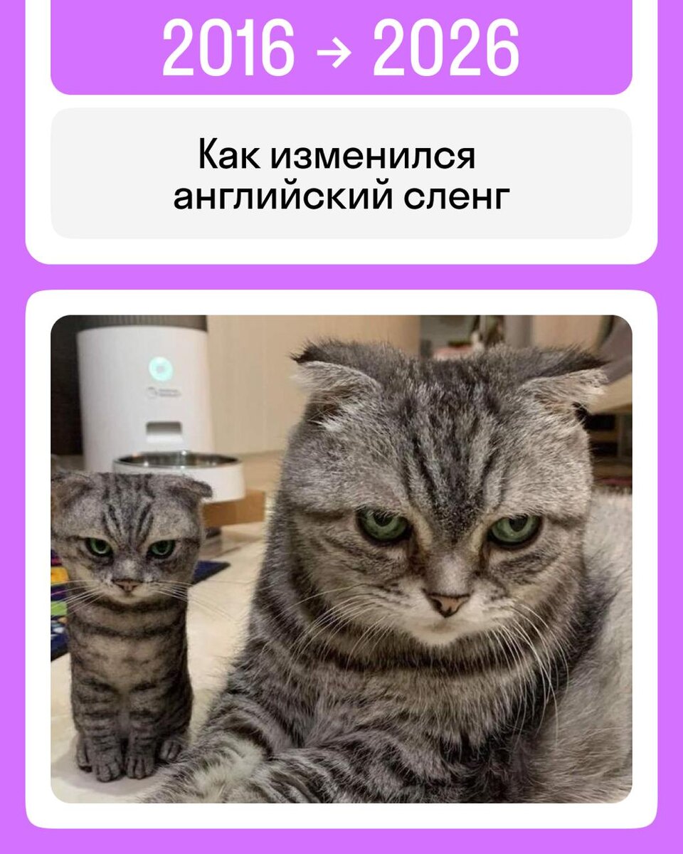 … Но так больше не говорят, если вы не знали! Вместо to flex и to troll в английском теперь используют другие слова. Мы поддались ностальгии и стряхнули пыль со старой интернет-лексики. Но и замену ей тоже принесли, а то прошлым жить всё-таки грустно 🥲 Михаила хоть ещё и ищем, но учёбу никто не отменял 🐈⬛️ 👉 Чтобы ещё через 10 лет не думать, как прокачать английский, самое время… Жить настоящим и начинать учиться: https://go.skyeng.ru/28englishcourse01tg24 В Skyeng это можно делать с комфортным графиком и на интерактивной платформе, которая показывает прогресс.