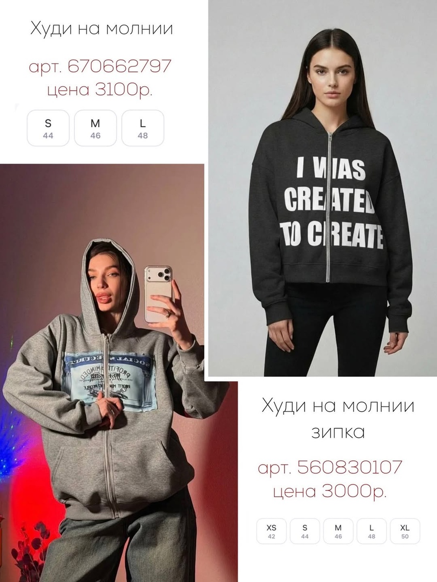 Вторая находка — тоже худи на молнии, но с более выраженной «графикой» и контрастной надписью. Такая вещь сразу делает образ активнее и моложе.