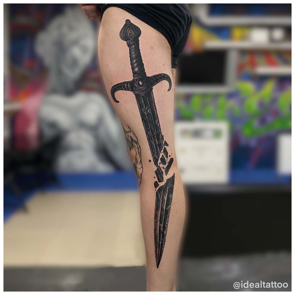 На фото представлена удивительная мужская татуировка — сломанный меч, занимающий всю ногу