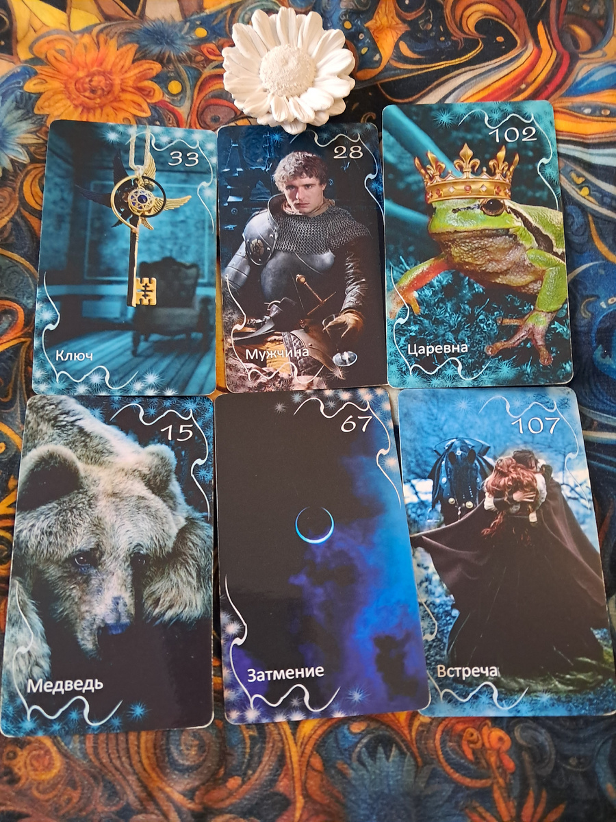 Ключ к изменению реальности (Совет): Судьбоносная Встреча. Ваш следующий шаг — не замыкаться, а сознательно искать или быть открытой той встрече (внешней или внутренней), которая рассеет тьму «Затмения» и покажет, как интегрировать вашу внутреннюю силу («Медведя») с вашей эмоциональной природой («КЧ»), перестав быть просто «Царевной».