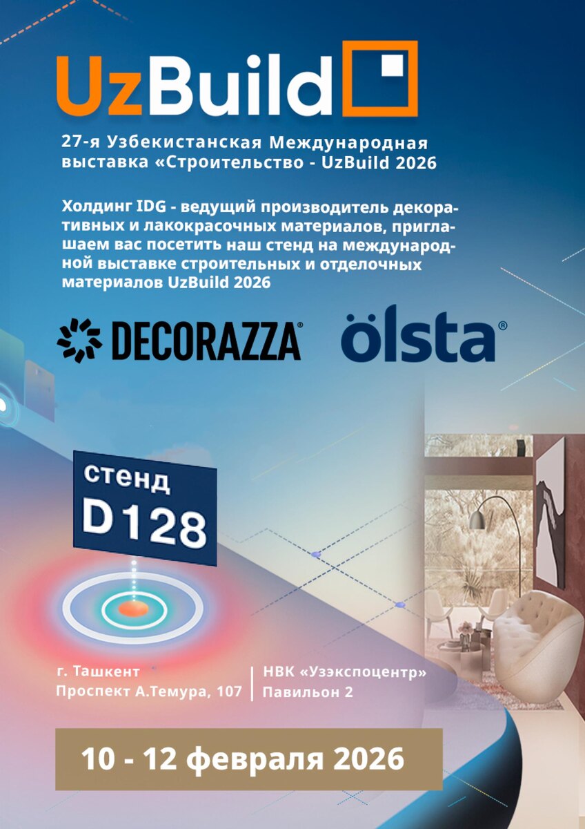 С 10 по 12 февраля 2026 холдинг Interra Deco Group представит на выставке свои бренды Decorazza и Olsta. На нашем стенде вы сможете: ⚡️ познакомиться с декоративными покрытиями и красками вживую ⚡️ увидеть актуальные эффекты и поверхности ⚡️ обсудить проекты, решения и возможности применения материалов 📍 Ждем вас на стенде D128 НВК «Узэкспоцентр», Павильон 2 г. Ташкент, проспект А. Темура, 107 Регистрация по ссылке ⬅️ Будем рады встрече, живому диалогу и новым профессиональным знакомствам!
