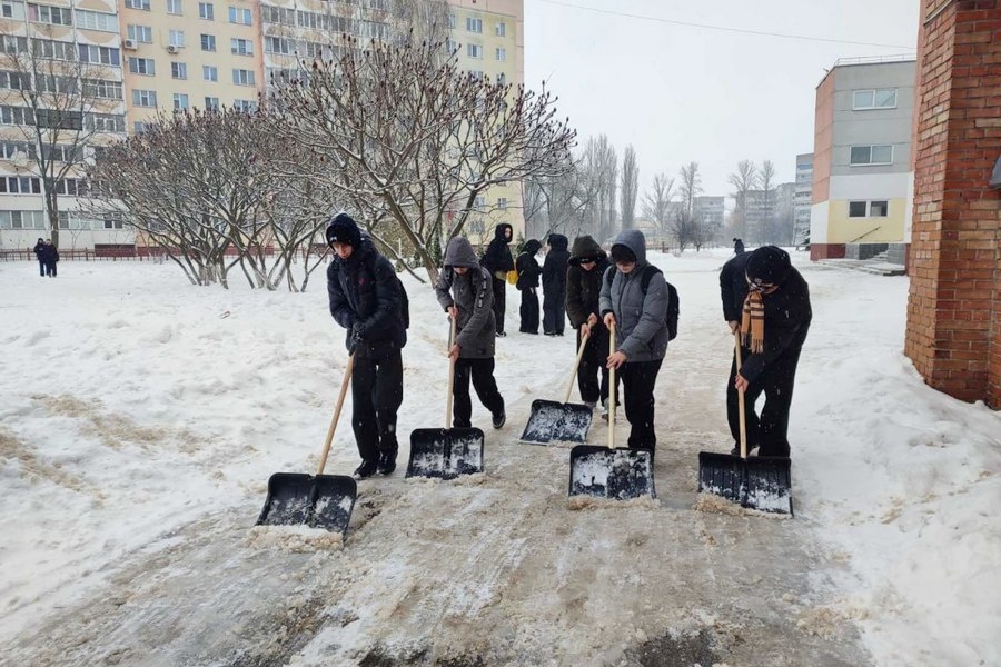 Дружной командой они вышли на улицу, чтобы расчистить школьную территорию от свежевыпавшего снега.