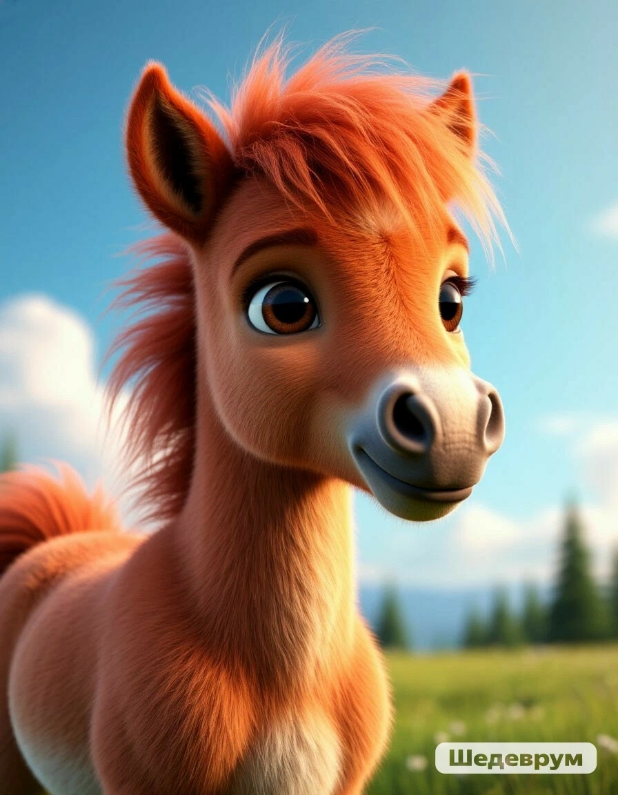 (крупный план, мультяшный пушистый мечтательный жеребёнок, 3d, digital art, hd, минимализм, поэтично).