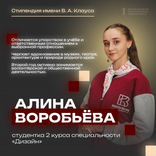 Студентка второго курса специальности «Дизайн» Алина Воробьёва стала обладателем престижной стипендии имени В.А. Клауса. Студент третьего курса специальности «Социально-культурная деятельность» Андрей Мартынов и преподаватель высшей квалификационной категории Илона Гуржий были удостоены стипендии имени Н.М. Карамзина. Поздравляем с заслуженным признанием и желаем новых смелых идей и вдохновения! Фото: Министерство искусства и культурной политики УО Наш канал в MAX