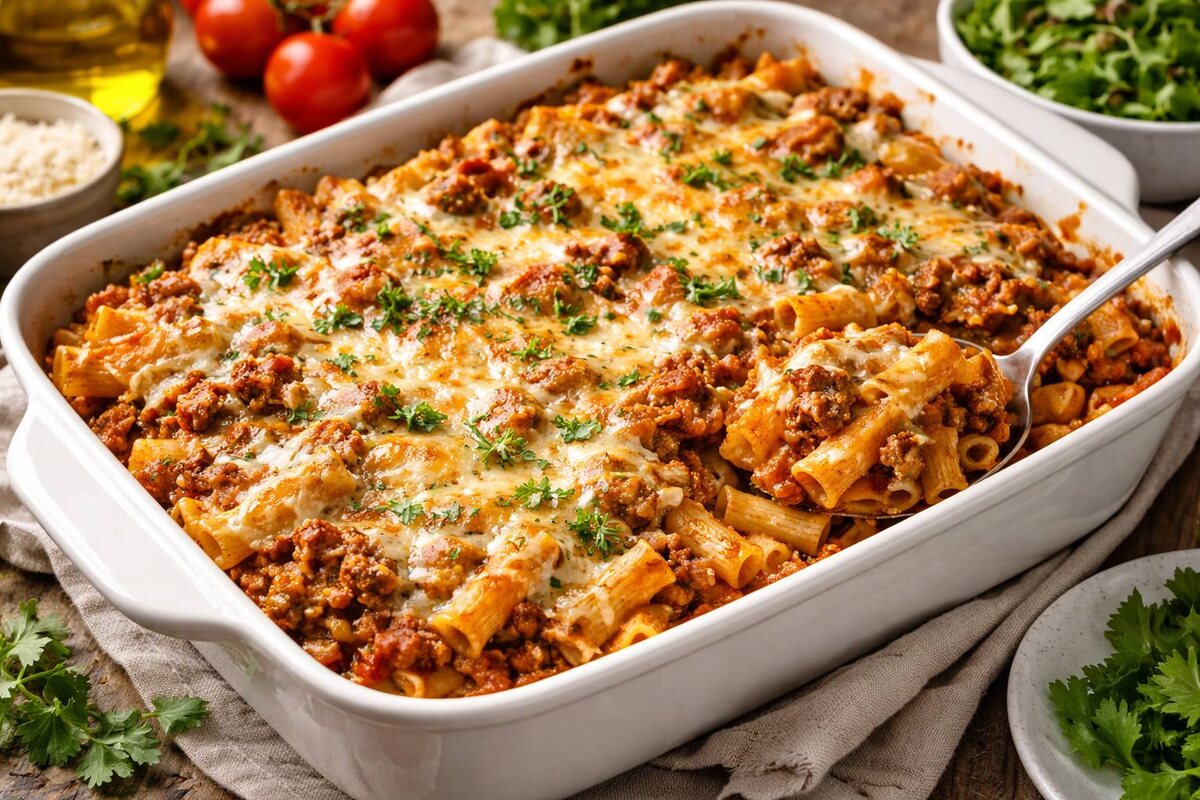 Сытный ужин из простых продуктов, который любят все — это запеканка. Есть блюда, которые не нуждаются в представлении. Макароны, фарш и томатный соус — это не кулинарный эксперимент, а проверенная формула спокойного, тёплого ужина. Когда не хочется выдумывать, но хочется, чтобы было вкусно, сытно и “как дома”. Эта запеканка хороша тем, что: • готовится из доступных продуктов, • подходит и для семьи, и для гостей, • отлично хранится и разогревается, • нравится и детям, и взрослым. А главное — она получается сочной, не сухой и с правильным балансом соуса и макарон. • Общее время: около 1 часа • Количество порций: 5–6 Основа: • Макароны (перья, рожки или спиральки) 300 г • Фарш (говядина + свинина или куриный) 400 г • Репчатый лук 1 крупный • Твёрдый сыр 120–150 г • Растительное масло 2 ст. л. Томатная заправка: • Томатная пассата или протёртые томаты 350–400 г • Томатная паста 1 ст. л. (по желанию, для насыщенности) • Вода или бульон 100 мл • Сахар ½ ч. л. • Соль по вкусу • Чёрный перец