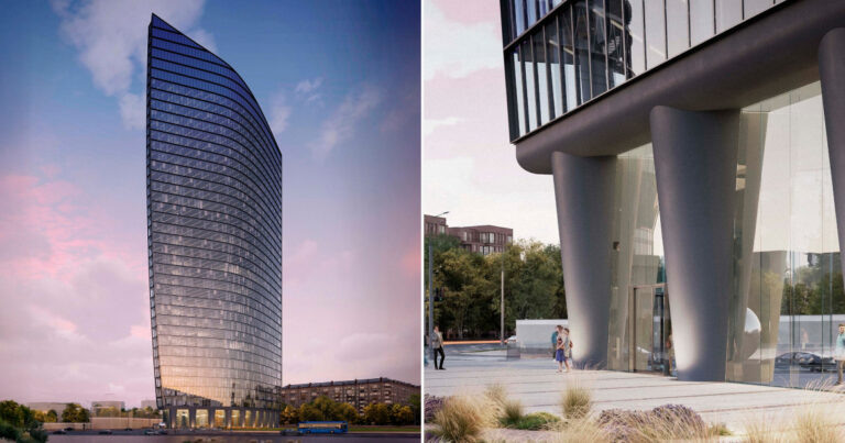 История трансформации проекта этой высотки в составе ТПУ «Суворовская» чем-то напоминает худеющих после новогодних праздников. Сначала плотный и не самый изящный силуэт, а потом — ближе к лету — внезапное избавление от лишнего: больше гибкости и неожиданной легкости. Первоначальный проект совсем не вызывал такое ощущение, но архитекторы добавили воздушности — и перед нами уже совсем другая высотка. Рендеры опубликовал канал «Стройки — и точка». В новой версии 34-этажный деловой центр рядом с «Олимпийским» тянется вверх на 178 метров, но вместо сужающегося кверху объема — плавно изогнутая башня, которая расширяется с каждым этажом. Стеклянный фасад собран горизонтальными лентами, из-за чего здание читается не как вертикальный клин, а как такой «текучий» объем. Изменился и первый уровень: башню приподняли над землей и поставили на опоры — своеобразные ножки. Под зданием как будто остается открытое пространство, заполненное витринами. На верхних этажах бизнес-центра еще запланирован двуху
