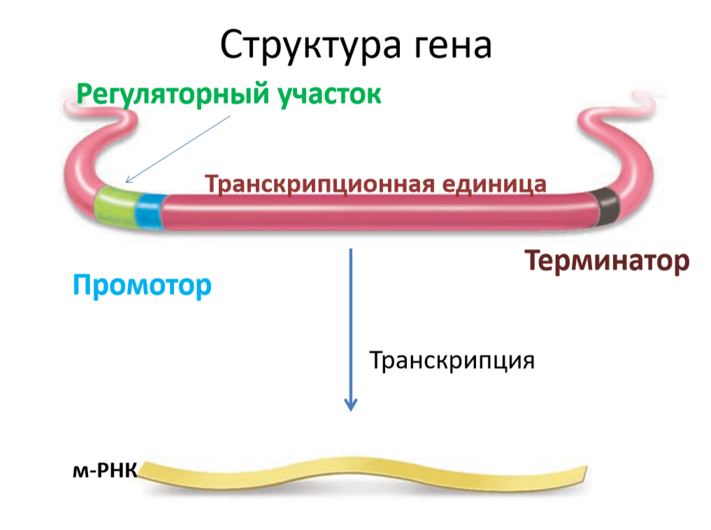 Синтез молекул РНК начинается в определенных участках ДНК - промоторах, а завершается в участках ДНК - терминаторах. Участок ДНК, ограниченный промотором и терминатором, представляет собой единицу транскрипции - транскриптон. В пределах каждого транскриптона копируется только одна из двух нитей ДНК, которая называется значащей (матричной, смысловой). Разбивка молекулы ДНК на множество транскриптонов обеспечивает возможность независимого считывания разных генов, их индивидуальные включения и выключения.