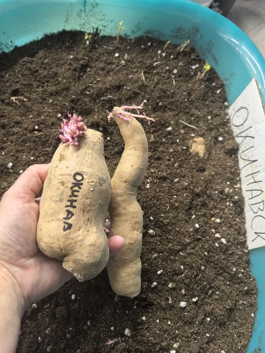 Самый загадочный сорт батата с одноименного острова в океане. Сколько лет мы его выращиваем, но он для нас так и остался загадкой. Для сезона 2026 г. решила выращивать пораньше. Клубни были занесены в тепло уже в декабре прошлого года🙂. Оставляла клубни на всякий случай с урожая 2024 года и на Новый год я их высадила для проращивания. Благополучно укоренились и начали давать росточки. Чем же так хорош этот японский сорт? Тем, что он необычный на вид - белая шкурка, фиолетовая мякоть, а вкус не сравнится ни с каким другим бататом. Что то такое нежное, фруктовое и приятной пюреобразной консистенции. Копать его не возможно, клубни чаще всего находишь либо на дорожке, либо в другой грядке😀. Но, ради вкуса, ему все прощается. Поэтому в этом году постараюсь высадить самым первым, чтобы осенью выкопать самым последним🤪, срок вегетации у него порядочный - 140 дней💜 #окинавский #клубнаядача #сортабатата