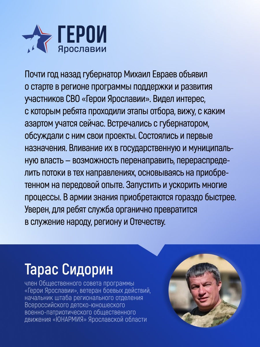 » Проект помогает участникам СВО найти себя в гражданской профессии и реализовать сильные стороны в новой сфере. Один из примеров — Виталий Лыков. С 1 января он возглавляет единую дежурно-диспетчерскую службу Ярославского округа. Он родился и вырос в регионе, прошел боевые действия, служил в правоохранительных органах, участвовал в СВО. За службу награждён государственными наградами, включая медаль «За отвагу».