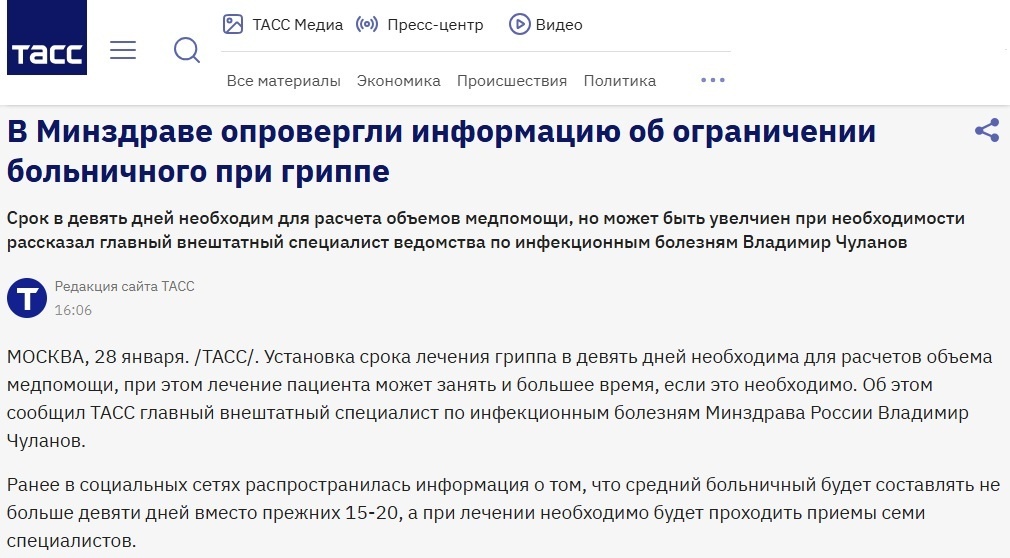 Ведомство пояснило, что сроки лечения не будут ограничены девятью днями "Установление единого ориентировочного срока лечения законченного случая продолжительностью девять дней носит организационно-плановый характер и необходимо для унификации расчетов объемов медицинской помощи как в амбулаторных, так и в стационарных условиях. При этом данный срок ни в коем случае не является жестким клиническим ограничением. В случае, если состояние пациента требует продолжения терапии, медицинская помощь будет продолжена в полном объеме, а пациент не подлежит выписке или прекращению наблюдения исключительно по формальному истечению девяти дней", - сказал главный внештатный специалист по инфекционным болезням Минздрава России Владимир Чуланов. Эксперт добавил, что решение о продолжительности лечения принимается лечащим врачом на основании клинических показаний. А указание на ежедневные осмотры врача-инфекциониста и терапевта относится прежде всего к стационарному этапу лечения, где круглосуточное мед