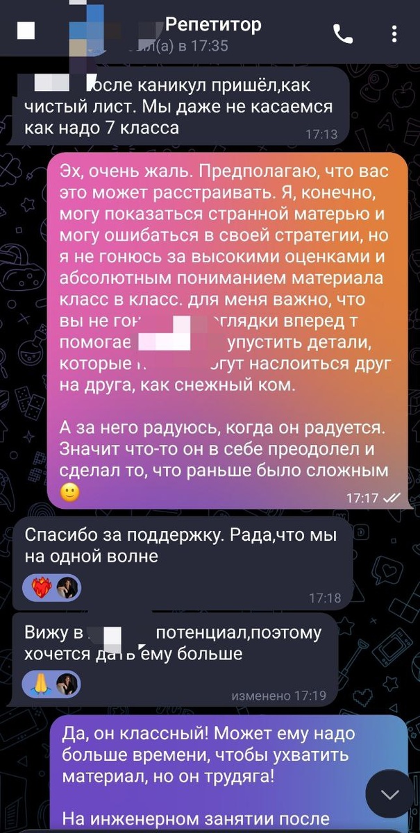 ? Сегодня пришло сообщение от сына подростка о полученной пятерке по математике. Поделилась с его репетитор. В резултате получилась вот такая переписка и вот такой пост. Знаете, что самое смешное? Если бы мне 5 лет назад дали почитать эту переписку, я бы восхитилась. Мама-то какая спокойная! Какая мудрая! А сегодня я перечитываю своё же сообщение и думаю: «Ира, это ж ты!». Быть мамой - не просто. Быть мамой подростка - не просто вдвойне. И давайте сразу развеем миф: у подростковых психологов дети не какие-то особенные, просветлённые единороги. Нет. Они такие же колючие. Так же закатывают глаза. Так же бубнят: «Ну мааам, как же ты мне надоела со своими вопросами!». Тоже бывают "чистыми листами" и по математике, и в жизни. Так в чём же разница? В том, что я как-то по-особенному терплю? Нет. Я тоже устаю. Я тоже злюсь. Я тоже иногда смотрю на этот «чистый лист» и чувствую, как подкатывает раздражение: «Ну как так?!». Разница в одном. И этому можно научиться (я точно знаю). У меня хва