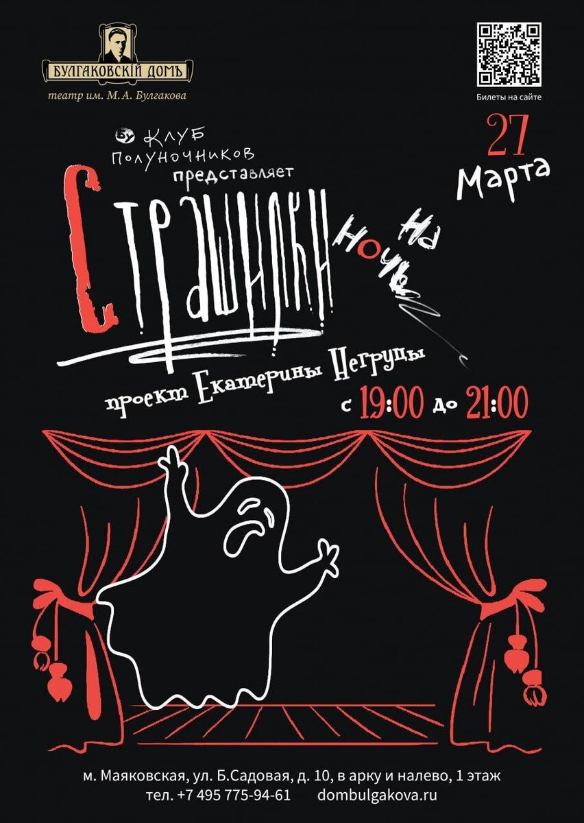 Страшилки возвращаются Добрый вечер, мои любимые читатели. С вами все также я, кот Бегемот. И да, Страшилки возвращаются. Вам уже страшно? Надеюсь, что да. Наш мистический иммерсивный спектакль «Страшилки на ночь» вновь будет показан в театре им. Булгакова в самый театральный вечер года – в Ночь Театров 27 марта. Страшные театральные байки переплетутся с великим наследием классиков, вы услышите призраков и леденящие душу истории. А для боязливых в течение всего дня мы будем проводить экскурсии по закулисью. Следите за новостями «Булгаковского дома». А билеты на иммерсивный спектакль «Страшилки на ночь» уже приобретайте. Билеты по ссылке: https://clck.ru/3RU5T7 Дата и время: 27 марта, 19:00 Продолжительность: 3 часа Место: музей-театр «Булгаковский дом», ул. Большая Садовая, 10 #домбулгакова #ПатриаршиеПруды #МихаилБулгаков