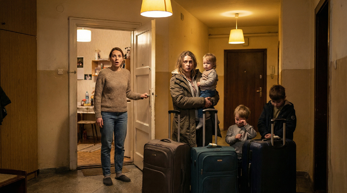 На пороге стояла Милана с тремя чемоданами и тремя детьми. Младший, лет четырёх, уже тёр глаза кулачками. Старшая девочка держала за руку среднего мальчика. Все трое смотрели на меня усталыми глазами.