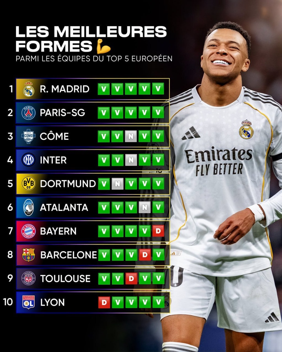 «Реал Мадрид» и «ПСЖ» — единственные клубы из топ-5 лиг Европы, одержавшие 5 побед в 5 последних матчах национального чемпионата.