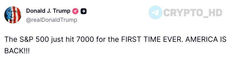 🚀 Дональд Трамп объявил: Индекс S&P 500 впервые преодолел рубеж в 7000 пунктов! По его словам, это знак того, что Америка снова на коне!