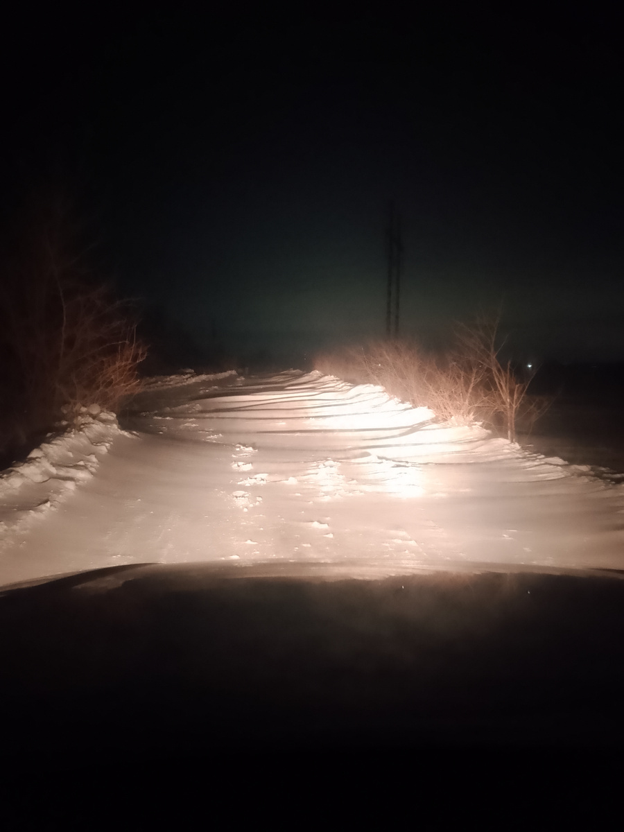 Ночью снова прогревала машину. Хотя можно было и не впрягаться, она отлично завелась, там ничегошеньки не замерзло. Потепление чувствуется. Ветер не такой ледяной, хотя шапку сносит, чехол на машину становится парусником. Вот то, что машина заведется, я была уверена, а что творится на дороге... тут сюрприз. Выехали, а там... Та-ра-рам...