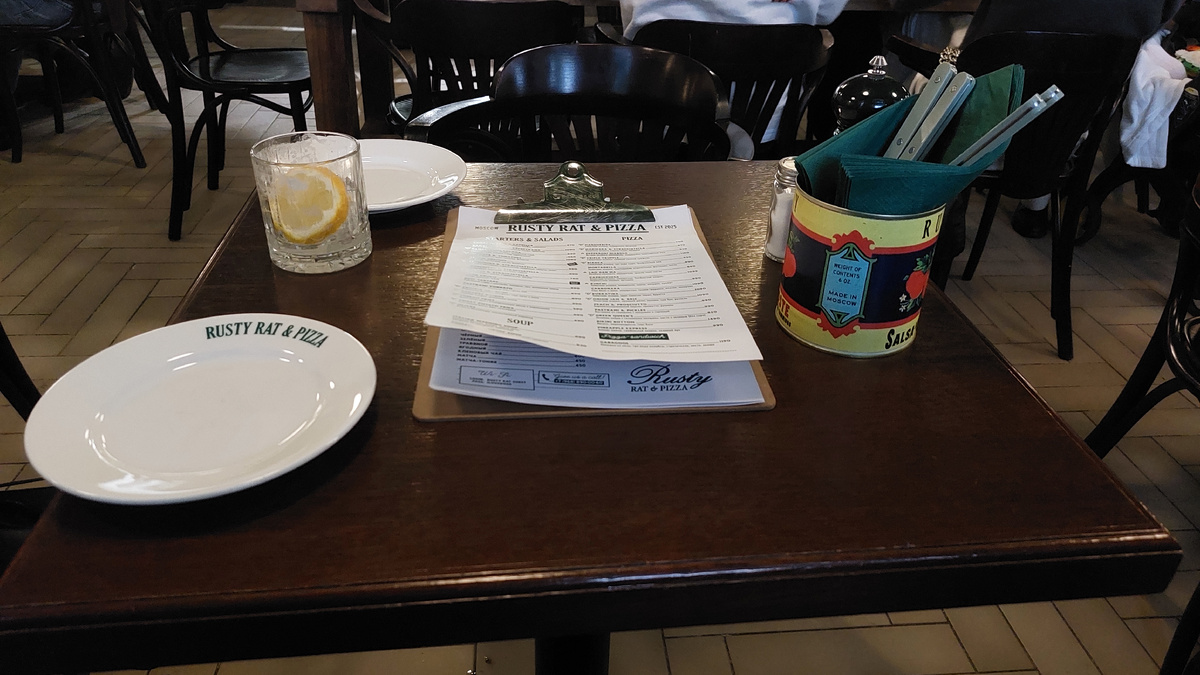 Итало-американская пиццерия Rusty Rat & Pizza открылась под занавес прошлого года во дворах Большого Черкасского переулка, вдали от главных гастрономических маршрутов Новой площади. Но нисколько там не потерялась, а наоборот, быстро стала новым центром притяжения у продвинутой молодежи. Создатели проекта – команда Underdog — предложили свою версию демократичной городской нью-йоркской кухни, максимально приблизив ее к заокеанскому оригиналу. Наша редакция решила выяснить, чем такой подход цепляет столичных гурманов. Интерьер Заведение довольно компактное и состоит из зала с барной стойкой и зоной бакалеи и основного помещения, с коммунальным столом посередине и очень маленькими столиками вокруг него. Основной мотив дизайна — андеграунд, на что намекает почти такая же плитка на стенах, как в переходах нью-йоркской подземки. Общий стиль дополняют выверенные детали — скейтборды, уличные указатели и банки из-под томатной пасты. Рядом с умывальником табличка на английском, призывающая мыть