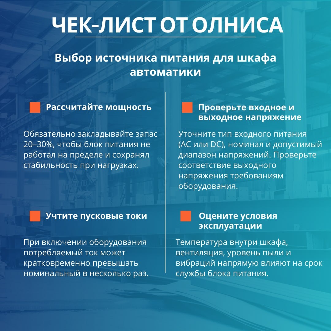 Источник питания — основа стабильной работы всей системы управления. Ошибка в расчётах может привести к сбоям, ложным срабатываниям или выходу оборудования из строя. Чтобы этого избежать, важно учитывать не только номинальную мощность, но и пусковые токи, условия эксплуатации и необходимость резервирования. Мы собрали короткий чек-лист — сохраните, чтобы не ошибиться при подборе ⬆️ 📦 Нужен подбор электрооборудования? Подберём решение под ваши условия: 🌐 olnisa.ru 📩 zapros@olnisa.ru 📞 8 (800) 333-19-59 #Олниса #Промышленность #Автоматизация #Оборудование #ИсточникиПитания #Электрика #ШкафАвтоматики #Инженерия
