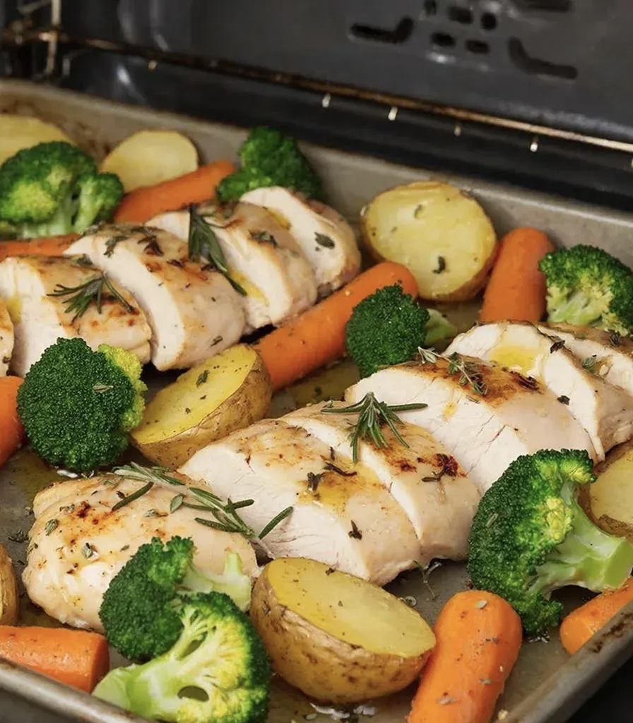 Ингредиенты: куриное филе (200 г), брокколи (100 г), морковь (1 шт.), картофель (2 шт.), оливковое масло, специи (розмарин, тимьян).
