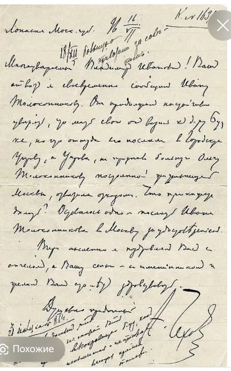 «На этом берегу Красноярск, самый лучший и красивый из всех сибирских городов... Много у меня было разных мыслей, и все они путались и теснились, как вода в Енисее, и мне было хорошо…». Чехов-человек глубокой скромности, буквы не выпячиваются. Он пишет экономно, бережливо. И всё же вверхней зоне, где графология видит стремление к идеалу, признанию проскальзывает желание быть замеченным. Почерк по мужскому типу: волевой, характерный. Его гибкость мышления проявляется в лёгкости формы, игре направлений букв, в неоднородности начертания. И вот подпись выделяется, как и сам Чехов. Имя заметное с точкой. Фамилия полностью. Конечный штрих-серпантин в лево, перо не отпускает бумагу. Я активно изучаю симптомы по почерку , по копии это не то. Хотя здесь заметен дрожащий неравномерный штрих, повышенный контроль, ущербность букв-болезненное состояние. Теперь я точно знаю, хочу в музей А.П. Чехова, рассмотреть почерк в оригинале. Как вам Чехов, он хороший психолог?