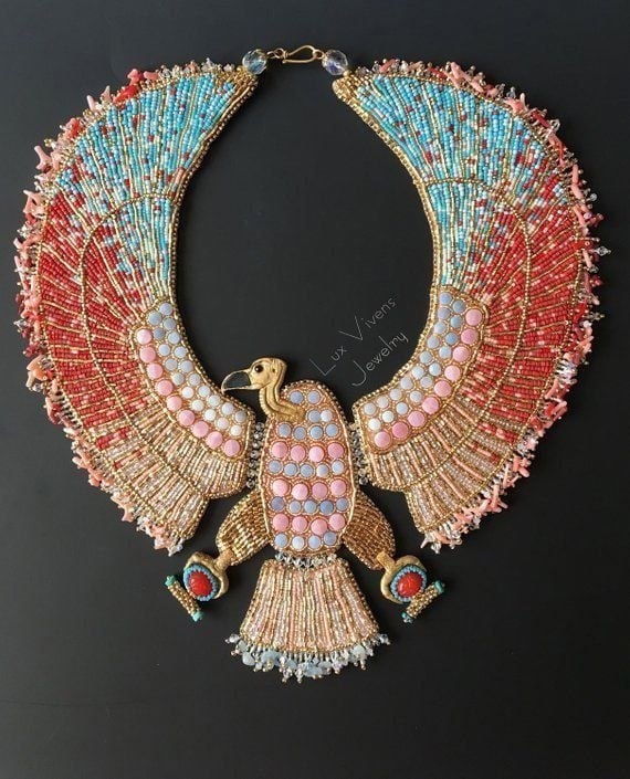 Очевидно, прототипом послужил образ богини Нехбет, защитницы царской власти, олицетворяющей Верхний Египет. Опал, аквамарин, горный хрусталь, коралл, бисер, кристаллы Swarovski, полимерная глина, позолоченная кожа. Автор - Lux Vivens Fashion. Терра инкогнита | Неизвестная земля