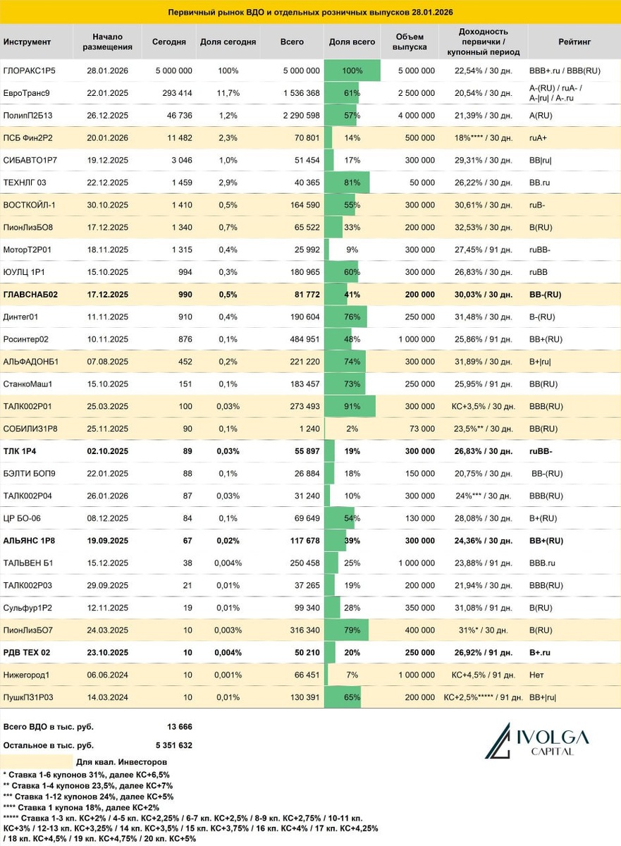 Итоги первичных размещений ВДО и некоторых розничных выпусков на 28 января 2026 г.