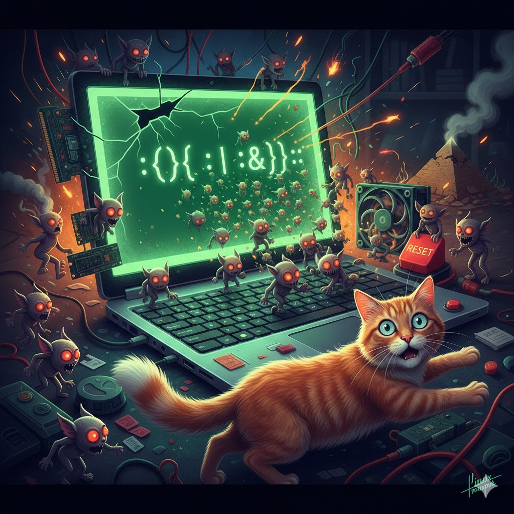 Привет! Слушайте сюда, любители поковырять пингвина палочкой! Сегодня я расскажу вам историю о том, как превратить ваш мощный многоядерный сервер в бездыханный кирпич, не используя молоток, святую воду или гнев сисадмина. Нам понадобится всего одна строчка, которая выглядит так, будто кота стошнило на клавиатуру древними шумерскими символами. Знакомьтесь, перед вами — Fork-бомба. В узких кругах её называют «цифровым суицидом», а выглядит она вот так: : ( ) { : | : & } ; : Если вы покажете это простому смертному, он решит, что вы пытаетесь вызвать Ктулху через командную строку. Но если присмотреться, перед нами — шедевр минимализма. Это полноценная программа на языке Bash, которая умещается в 11 символов. Давайте разберем этот «иероглиф» по косточкам, пока мой внутренний демон не нажал Enter: Как только вы нажимаете клавишу ввода, начинается ядерная реакция. Одна функция создает две, две создают четыре, четыре — восемь... Через доли секунды количество процессов в вашей системе перевали