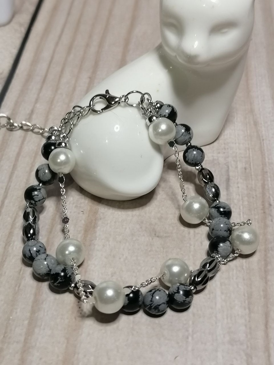 Браслет многослойный. В данном случае двойной. На одной ниточке жемчужные бусины с цепочкой, на другой ниточке снежный обсидиан с металлическими бусинами. Застежка карабин с удлиняющей цепочкой. Минимальный размер 16 см (объем запястья)