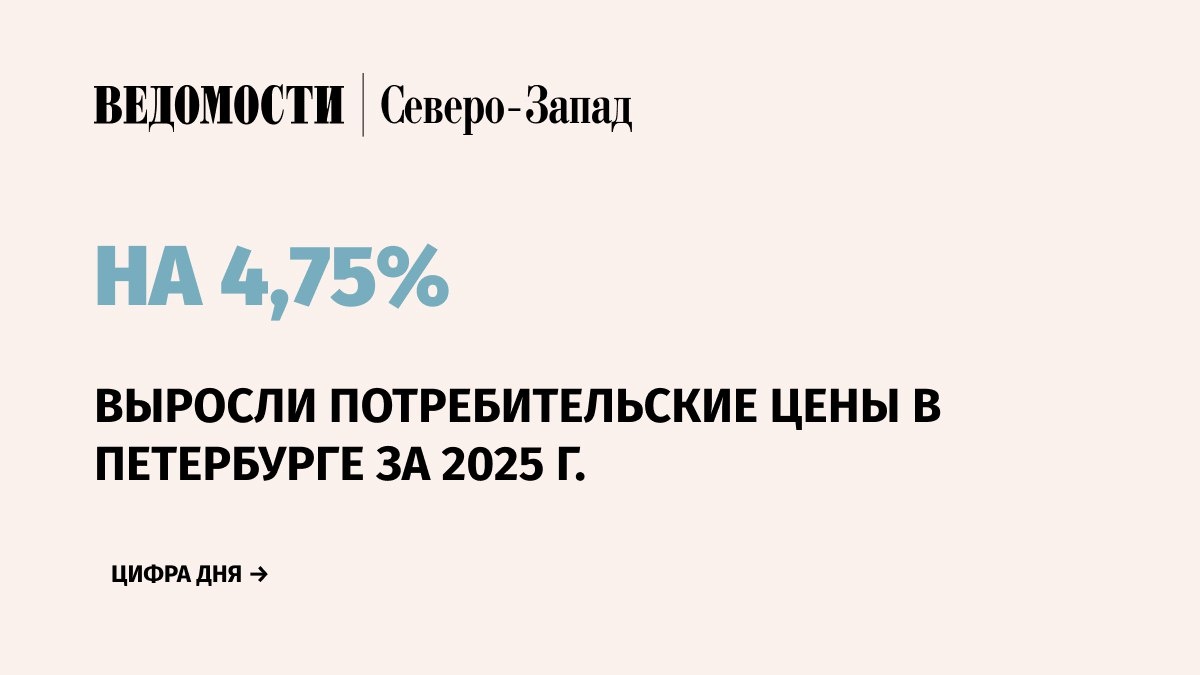 составил 104,75%. В декабре рост цен почти остановился, составив лишь 0,14% к ноябрю, следует из данных Петростата. ▶️За месяц сильнее всего выросли цены на огурцы (на 22,7%), лук репчатый (5,1%) и билеты в театры (на 17,9%). Основной вклад в годовую инфляцию внесла группа услуг, цены на которые выросли за год на 7,63%. ▶️За декабрь заметно подорожали полисы ОСАГО (8,9%) и ветеринарные услуги (2,9%). В то же время услуги зарубежного туризма за месяц подешевели на 10,1%. Стоимость минимального набора продуктов питания в декабре составила 8563,35 руб. в месяц, увеличившись за ноябрь на 0,8%. 🟩В Ленинградской области годовой индекс потребительских цен оказался выше – 107,22%. За декабрь прирост составил 0,13%. Как и в Петербурге, в декабре в области резко подорожали огурцы (на 23,9%). Максимальный рост в сфере услуг также показали полисы ОСАГО (на 14,1%) и театральные билеты (8,5%). 🗞 Telegram | 🗞 Max