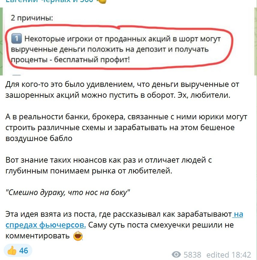 ‼️Юмор дня. К тому предыдущему посту. Опять подписчики скинули... Сегодня я умру от смеха 😂😂😂 ☝️Как оправдываются люди которые не были трейдерами и поэтому не понимают как рынок работает. Оказывается есть схема при которой когда ты продаёшь акции в шорт. Деньги за это платишь не ты. А платят тебе. Ну вы поняли у вас и шорт появляется и новые деньги из ниоткуда, которые "выручены от продажи в шорт". Которые ещё можно положить на депозит! ☝️Но схема настолько секретная и доступна только "серьёзным людям". Что рассказать про неё ну никак нельзя. (Это не стёб, автор поста в комментариях это так и объяснил, подписчики скинули) 😂😂😂😂 #юмор #мем Зы... Я дико извиняюсь, но это сделало мой день.... 😂🤣