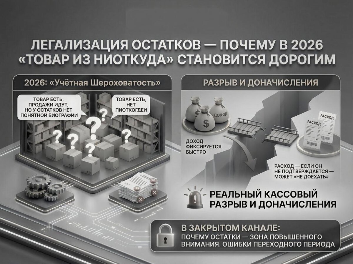 В 2026 у бизнеса всё чаще «всплывает» одна и та же история — товар есть, продажи идут, но у остатков нет понятной биографии. Пока обороты небольшие, это кажется терпимой «учётной шероховатостью». Но как только бизнес становится заметнее, остатки начинают читаться иначе — как разрыв между деньгами, документами и моделью. Самый неприятный эффект — кассовый. Доход фиксируется быстро. А расход — если он не подтверждается логикой и документами — может «не доехать». И тогда прибыль в отчёте превращается в реальный кассовый разрыв и доначисления. 📢 В закрытом канале мы разобрали глубже, почему в 2026 остатки стали зоной повышенного внимания — и какие ошибки переходного периода обходятся дороже всего.