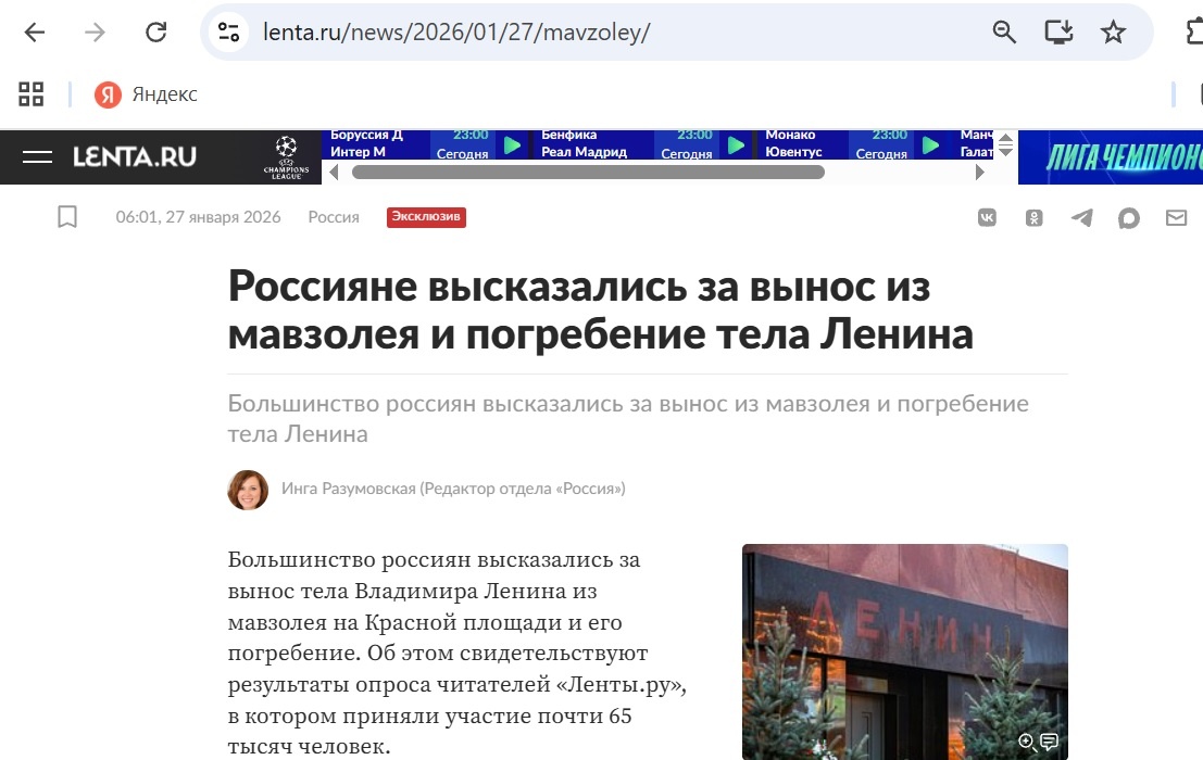 Как нам сообщили в СМИ — «Большинство россиян высказались за вынос тела Владимира Ленина из мавзолея на Красной площади и его погребение. Об этом свидетельствуют результаты опроса читателей «Ленты.ру», в котором приняли участие почти 65 тысяч человек» https://lenta.ru/news/2026/01/27/mavzoley/ Отметим, что прямо под этой статьёй стоит дизлайков примерно в пять с половиной раз больше, чем лайков. Это заставляет серьёзно усомниться в том, что читатели «Ленты» ДЕЙСТВИТЕЛЬНО думают так, как написано в статье. Что тут ещё можно сказать? Очевидно, что чем выше цены на продукты и коммуналку, чем дальше от нас право на образование, медицинскую помощь и пенсию, чем больше обстоятельств, о которых имеют право говорить только специально уполномоченные военкоры (а все остальные должны молчать под страхом поездки следом за Кагарлицким*), в общем, чем «интереснее и замечательнее» с каждым днём становится наша жизнь, тем больше (у некоторых лиц) желания стереть все упоминания о том, что когда-то эта
