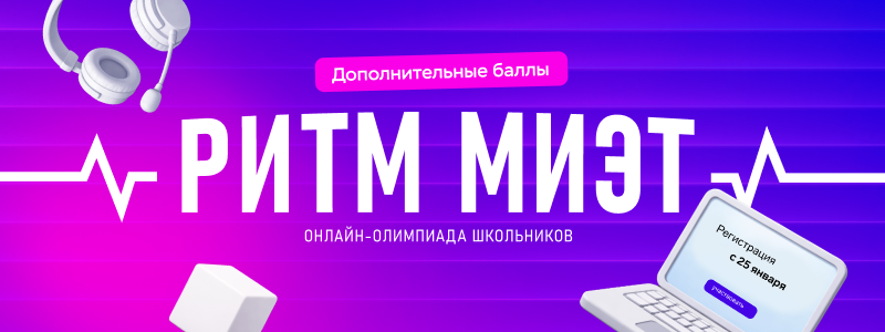 НИУ МИЭТ приглашает учащихся 10 и 11 классов, а также студентов ссузов принять участие в онлайн-олимпиаде «РИТМ МИЭТ». Призеры и победители Олимпиады получат дополнительные баллы к ЕГЭ при поступлении в МИЭТ: +8 для победителей, +6 для призеров. Олимпиада пройдет до 9 секциям: - Математика - Физика - Информатика и ИКТ - Русский язык - Химия в экологии - Основы правоведения - Обществознание и экономика - Английский язык - Компьютерная графика и дизайн В олимпиаде два этапа, которые проводятся онлайн. В первом этапе необходимо выполнить тестовые задания с выбором правильного ответа. Участники, набравшие не менее 50% верных ответов, будут допущены к участию во втором этапе. Второй этап – экспертная проверка предоставленных участниками решений заданий или проектов. 1 этап — с 25 января по 16 марта 2 этап — с 13 по 30 апреля Обязательным условием участия в Олимпиаде является регистрация участника на сайте account.miet.ru. После авторизации участник должен заполнить заявление на сайте accou