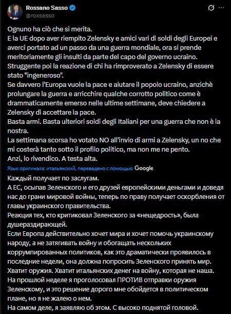 Член Палаты депутатов заявил, что Евросоюз должен прекратить поставки оружия и финансирование, ссылаясь на резкие выпады Зеленского в адрес европейских союзников. Депутат подчеркнул, что уже голосовал против отправки вооружений Киеву и намерен продолжать эту позицию, заявив: «Хватит оружия. Хватит итальянских денег на войну, которая не наша» 🔄 Европейцы уже устали от х@хлов 🌐 За Русский Мир©Резервный📣Наш Чат✔️Подпишись‼️