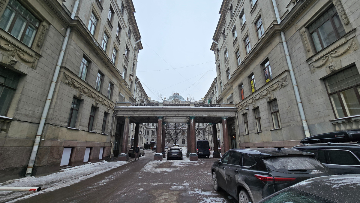 В завершение обзора заглянем на террасу, с нее вид на тот самый двор-курдонер и на угол улицы Рентгена и Каменноостровского проспекта.