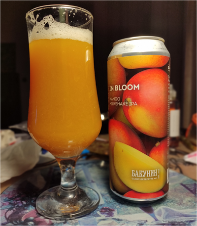 Вот не понимаю, почему отечественные пивовары пишут названия пива по-английски: написали бы "В цвету" - чем хуже? Нет, по-аглицки: надеются на импорт? Серьёзно? Или отечественный покупатель, видя на банке "БАКУНИН IN BLOOM" сразу же и непременно полезет в карман за деньгами? Это я так, поварчиваю. Чтоб радость оттенить. Мне разрешили 1 баночку в неделю! 6-) Естественно, полез в закрома, а там... Вот такое чудо аж 2024 года издания: Да знаю я, знаю! Да, ипу нужно пить свежую: хмель умирает, то-се... Но вот нашел в закромах - не выкидывать же? Взял я ее, вроде, в Москве, в Беру выходной. Пена поначалу обильная, но потом быстро исчезает. Из среднего размера пузырьков. Цвет - тоже манго, и, конечно же, пиво непрозрачное - милкшейк же. И в нем плавают мелкие кусочки чего-то - надеюсь, как обещано в составе, частички пюре манго. Аромат - манго. Такой яркий.. И чуть травки - правильной травки 4-) И чуть кисловато. И чуть пыльно. И немного пряно. На вкус пиво - полное продолжение аромата: ма