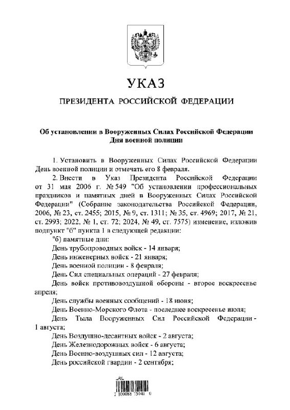Владимир Путин подписал Указ «Об установлении в Вооруженных Силах Российской Федерации Дня военной полиции».
