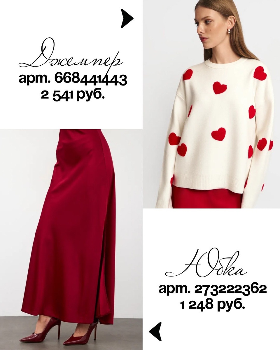 Эта подборка — как готовая палитра настроений: от романтичного белого джемпера с сердцами до бархатного бордо и строгого чёрного вечера. Самая сильная сторона таких находок — их сочетаемость: одна юбка может быть и нежной, и дерзкой; один жакет — и повседневным, и вечерним; одно платье — и «на выход», и «на особый случай».