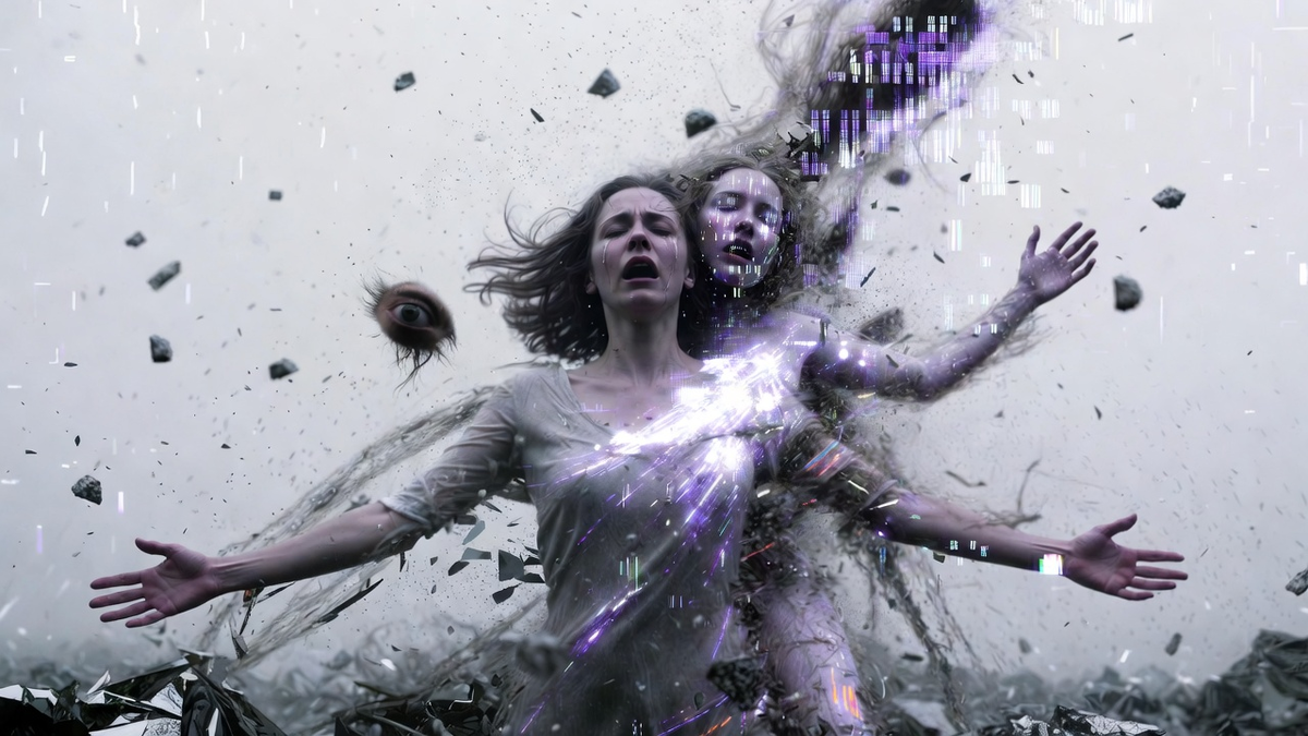 Форма гибрида стала терять целостность. Он не взрывался — он рассыпался. Как песчаный замок под набежавшей волной. Свет гас, тени расплывались. От него оставались лишь отдельные фрагменты — глаз, плывущий в пустоте; рука, сложившаяся в забытом жесте; строка кода, медленно гаснущая.
