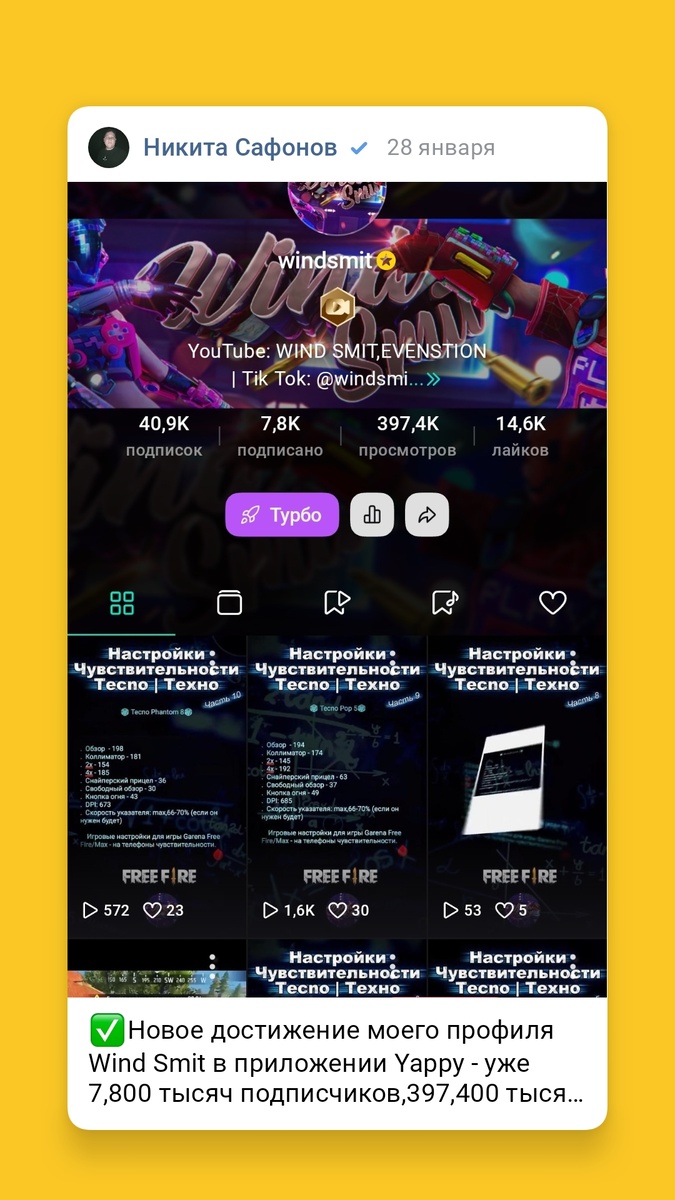 ✅Новое достижение моего профиля Wind Smit в приложении Yappy - уже 7,800 тысяч подписчиков,397,400 тысяч просмотров и 14,600 тысяч лайков! - на 28 января 2026 года!(На сегодняшний день)