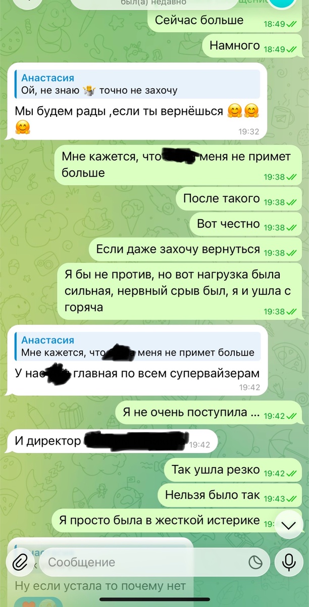 Написала и начала с того, что я такой хороший сотрудник и почему я ушла. Я говорю, что не выдержала, устала физически и морально от такого количества звонков. Что прям больше не могу, понимаю это.