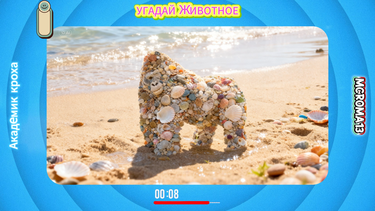 Перед вами живописная пляжная сцена: нежные волны ласкают берег, песок переливается в лучах солнца, а повсюду рассыпаны ракушки и камешки, будто оставленные самой морской стихией. Но в этом морском пейзаже таится нечто необычное — фигура, собранная из природных сокровищ: разноцветных ракушек, гладких камешков и морских находок. На первый взгляд, это просто причудливая композиция, хаотичное нагромождение морских даров. Однако при более пристальном рассмотрении в этой мозаике проступает чёткий силуэт. Контуры фигуры напоминают живое существо: угадываются очертания головы с выраженными «бровями» и «носом», массивное туловище, крепкие «ноги», устойчиво стоящие на песке. Вся композиция словно выросла из пляжа — настолько органично она вписана в окружение. Свет играет на поверхности ракушек, создавая иллюзию движения и объёма. Морские раковины формируют «шерсть» или «чешую», а отдельные камешки подчёркивают рельеф фигуры. Эта загадочная форма не кричит о своём присутствии, а будто приглашает
