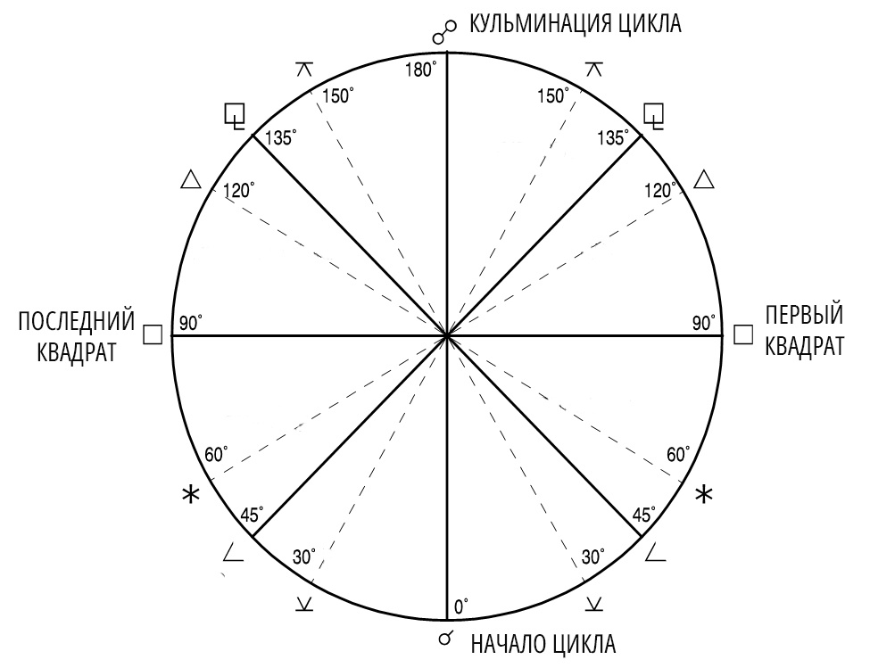 Именно с этого момента запускается новый период, который будет разворачиваться примерно в течение двух лет. Такой период называется: синодический цикл. Проще всего объяснить так: синодический цикл — это время от одного соединения планет до следующего соединения. Например, Марс догоняет Сатурн происходит соединение, затем Марс уходит вперёд, делает к Сатурну напряжённые аспекты и через некоторое время снова догоняет его. В этот момент начинается новый цикл. Для Марса и Сатурна этот процесс занимает примерно: около 2 лет Поэтому астрологи говорят: соединение запускает двухлетний период изменений. Цикл не идёт равномерно. Он развивается через поворотные точки — аспекты между планетами. Вот классическая структура на примере соединения. Начало цикла. Это момент запуска. В этот