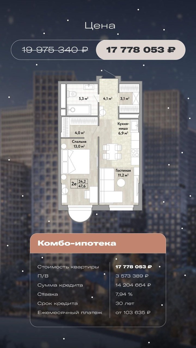 , Искрящийся пушистый снег… ✨ Глядя на ЖК «Новые Смыслы», хочется говорить стихами! Такая сказочная здесь атмосфера и такие классные квартиры! Спешу поделиться с вами новой подборкой лотов с расчетом по семейной ипотеке. 😉 Ставьте реакции и я продолжу Вас радовать скидками ⭐ и акциями 🎁