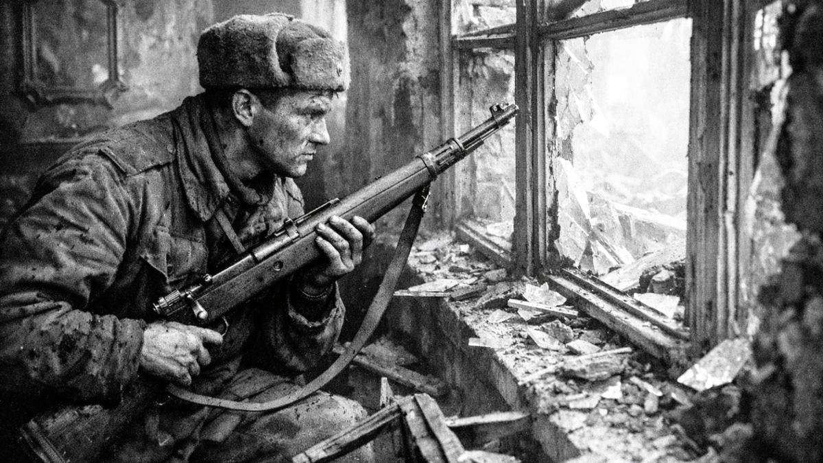 Герой упоминает немецкий карабин (Mauser 98k). Для связиста это был отличный трофей — кучность стрельбы Маузера выше, чем у ППС, что позволило Литвиненко держать оборону дома, методично снимая врагов из окон.