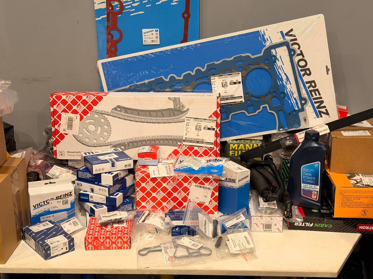 Мотор ещё не разобрали, но запчасти уже приехали, наверняка не все, но основное. Получился такой праздничный стол)) не хватает только маслонасоса, а он скорее всего понадобится( и распредвалов… #историяоднойбмв