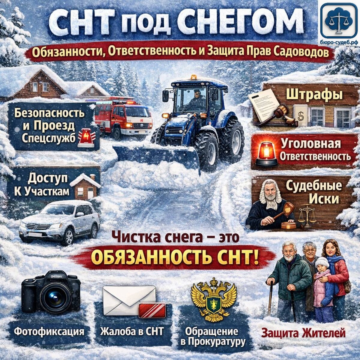 С наступлением зимы вопрос чистки снега в СНТ становится одним из самых актуальных. Садоводы жалуются на недоступность участков, а председатели сталкиваются с дефицитом техники и высокими расходами. Разберёмся, почему уборка снега — это не прихоть, а обязанность, и что грозит СНТ за бездействие. --- Обязанности СНТ по уборке снега: СНТ обязано поддерживать дороги и проезды в надлежащем состоянии по двум ключевым причинам: 1. Безопасность и доступ экстренных служб: 🚒🚑 • Дороги должны быть свободны для беспрепятственного проезда МЧС (пожарные), скорой помощи, газовой службы, энергоснабжающих организаций и другой спецтехники. Это напрямую влияет на жизни и здоровье людей, а также на сохранность имущества. 2. Доступ собственников к участкам: 🏡 • Снежные завалы не должны препятствовать собственникам и их гостям свободно подъезжать к своим земельным участкам. --- Последствия для СНТ и председателя: Ненадлежащая уборка снега может повлечь крайне серьезные последствия: 1. Администрат